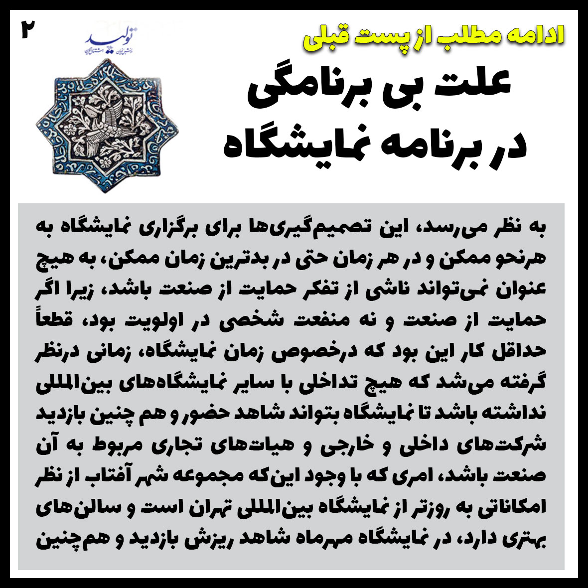 چه ضرورت و اجباری در برگزاری نمایشگاه توسط انجمن وجود داشت که حتی حاضر به برگزاری آن در محل دیگری و آن هم در زمان بسیار نامناسب یعنی دو روز بعد از نمایشگاه چرسای و تکنا ایتالیا که مهمترین رویداد نمایشگاهی در دنیاست شدند؟