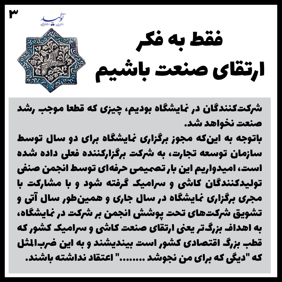 لذا انجمن صنفی تولیدکنندگان کاشی و سرامیک نیز از سال 1392 قاعدتاً نمیتوانستند با همان ساختار انجمن نمایشگاه را برگزار کنند، لذا انجمن تصمیم به تاسیس شرکتی بهنام "پویانگار سرام پارسیان" میگیرد که ساختار هیات مدیره این شرکت، همان اعضای انجمن صنفی در آن دوره هستند.