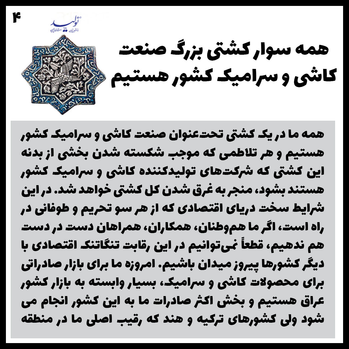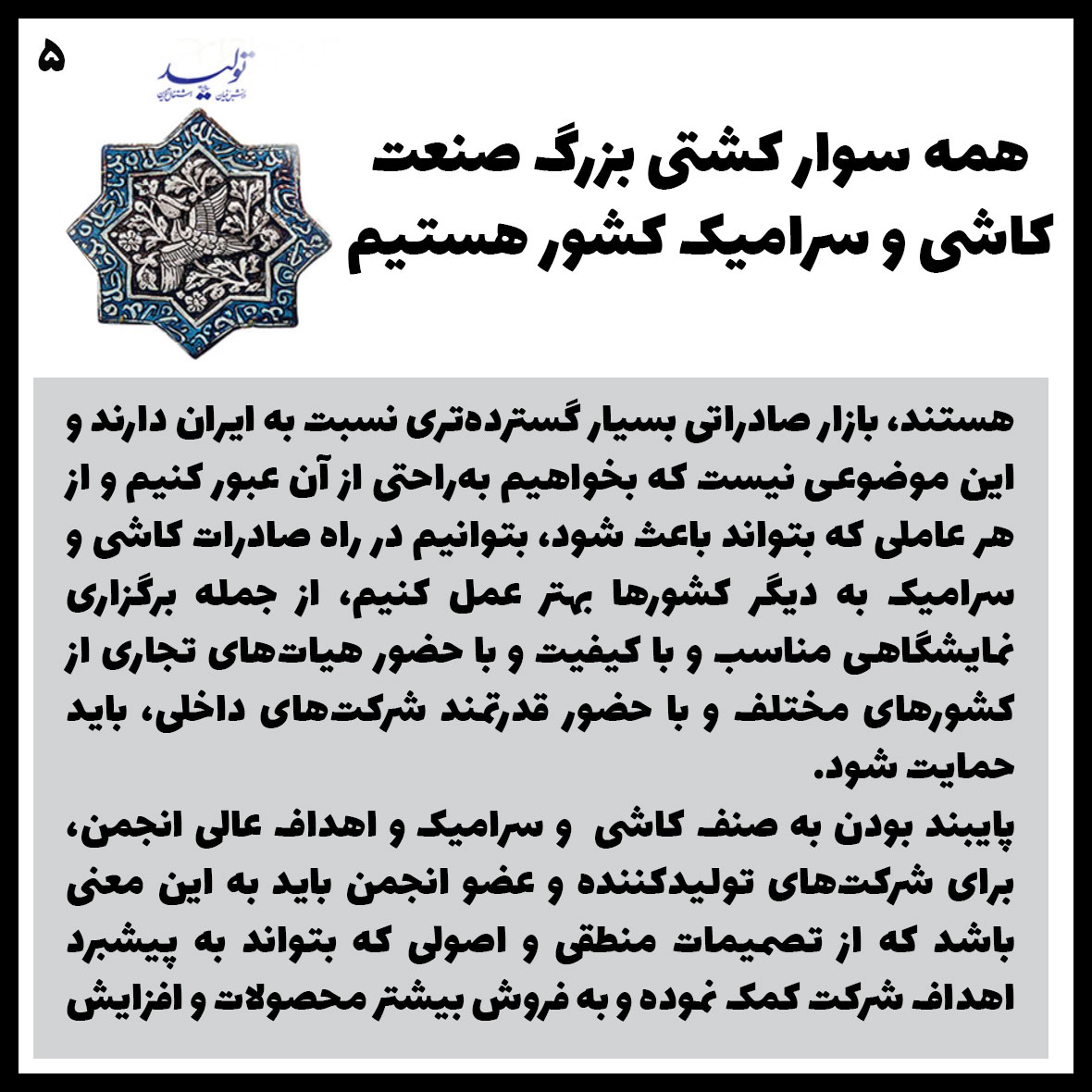 چرا در کشور ترکیه، نهادهای مرتبط با برگزاری نمایشگاه، همه ساله دست در دست هم داده تا یک نمایشگاه در سطح بینالمللی و با مشارکت شرکتهای داخلی و خارجی برگزار شود و قطعاً در نهایت منفعت برگزاری یک نمایشگاه عالی، عاید شرکتکنندگان در نمایشگاه و تولیدکنندگان کاشی و سرامیک آن کشور خواهد شد. اما در ایران، در مهرماه نمایشگاهی توسط انجمن برگزار میشود که تاریخ آن را دو روز بعد از نمایشگاه چرسای در نظر گرفتهاند. تاریخ برگزاری نمایشگاه چرسای از سال گذشته مشخص بود و مسئولین برگزاری نمایشگاه نباید به این موضوع قبل از تصمیمگیری به برگزاری نمایشگاه توجه کنند؟ چرا این مشکلات در کشورهای دیگر رخ نمیدهد؟