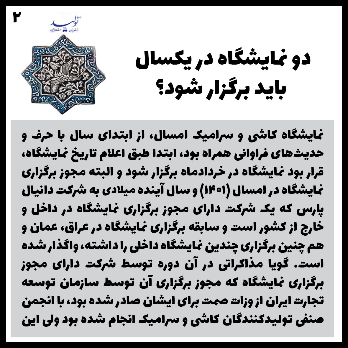 نمایشگاه کاشی و سرامیک امسال، از ابتدای سال با حرف و حدیثهای فراوانی همراه بود، ابتدا طبق اعلام تاریخ نمایشگاه، قرار بود نمایشگاه در خردادماه برگزار شود و البته مجوز برگزاری نمایشگاه در امسال (1401) و سال آینده میلادی به شرکت دانیال پارس که یک شرکت دارای مجوز برگزاری نمایشگاه در داخل و خارج از کشور است و سابقه برگزاری نمایشگاه در عراق، عمان و هم چنین برگزاری چندین نمایشگاه داخلی را داشته، واگذار شده است. گویا مذاکراتی در آن دوره توسط شرکت دارای مجوز برگزاری نمایشگاه که مجوز برگزاری آن توسط سازمان توسعه تجارت ایران از وزات صمت برای ایشان صادر شده بود، با انجمن صنفی تولیدکنندگان کاشی و سرامیک انجام شده بود ولی این مذاکرات به سرانجام نرسید و این دو مجموعه نتوانستند بر سر برگزاری نمایشگاه با همکاری انجمن به توافق برسند. سازمان توسعه تجارت ایران از سال 1392 دستورالعملی را صادر کرده بود که نمایشگاهها باید توسط شرکتهای دارای مجوز برگزاری نمایشگاه مدیریت و اجرا شوند و انجمنهای صنفی حق برگزاری نمایشگاههای مربوطه را ندارند و باید سیاستگذار باشند نه برگزار کننده.