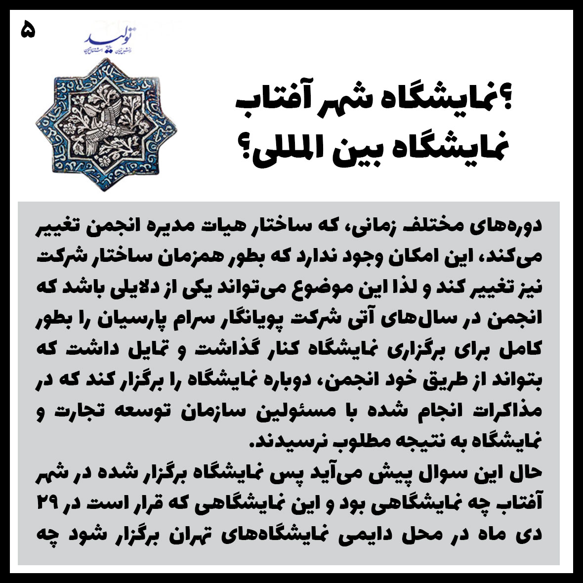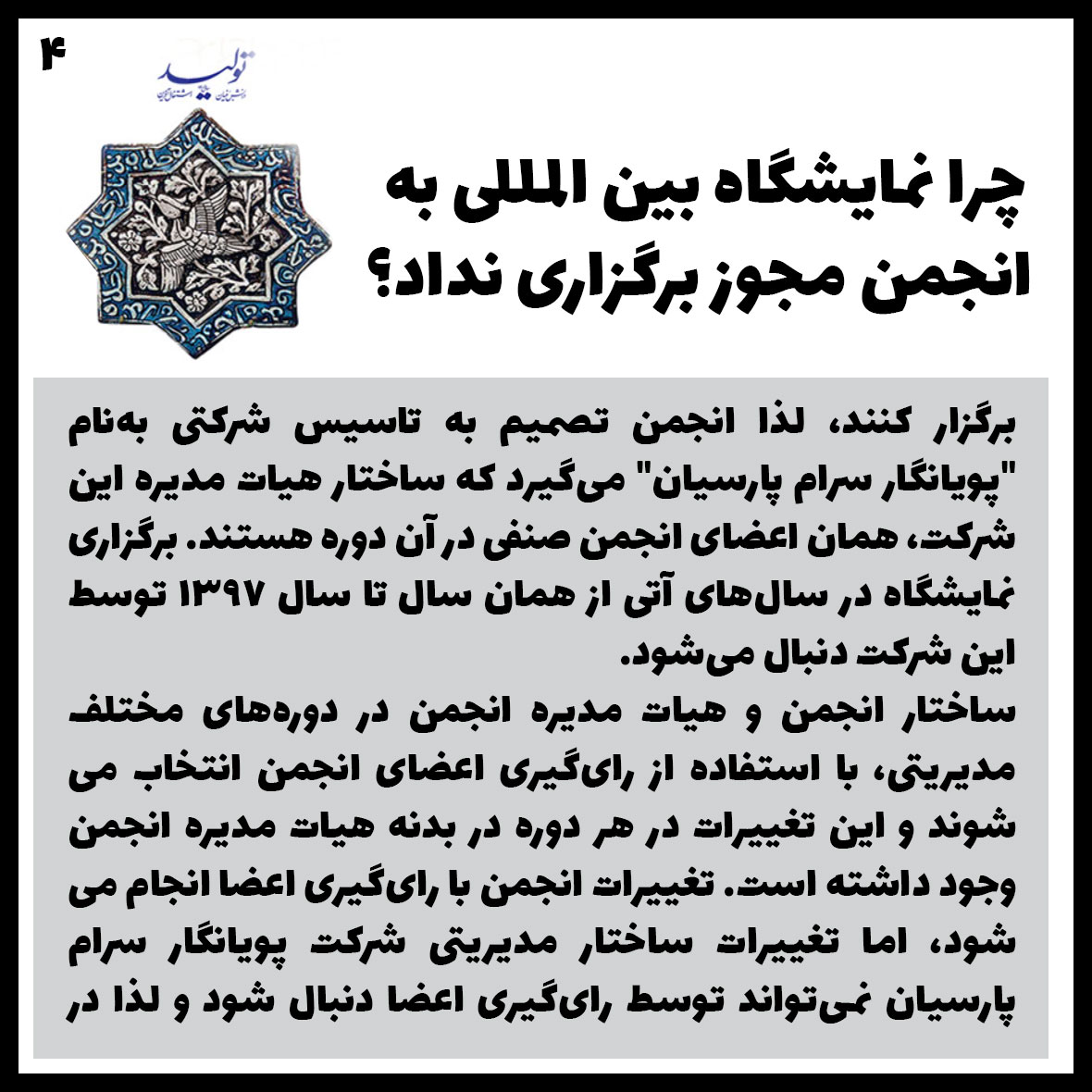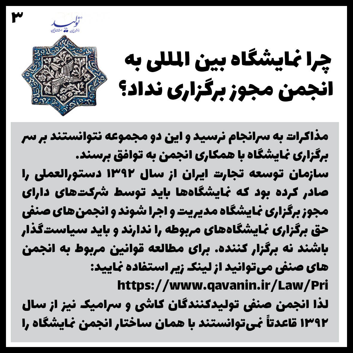 چرا اعضای هیات مدیره انجمن حاضر به همکاری با شرکت دارای مجوز برگزاری نمایشگاه نشدند و از اعضای خود التزام عملی میخواهند؟ چرا ما نباید همانند تمام دنیا، به فکر اقتصاد و صنعت باشیم؟