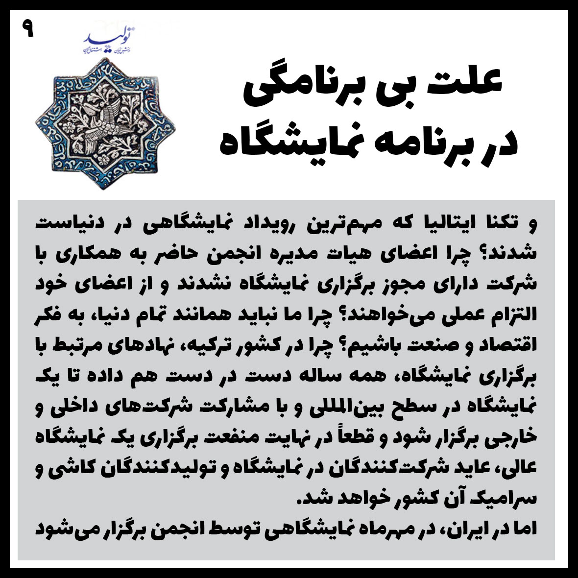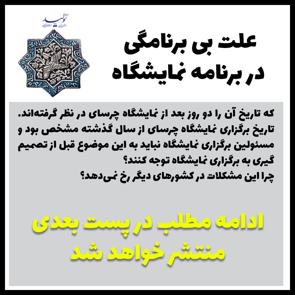 چه ضرورت و اجباری در برگزاری نمایشگاه توسط انجمن وجود داشت که حتی حاضر به برگزاری آن در محل دیگری و آن هم در زمان بسیار نامناسب یعنی دو روز بعد از نمایشگاه چرسای و تکنا ایتالیا که مهمترین رویداد نمایشگاهی در دنیاست شدند؟